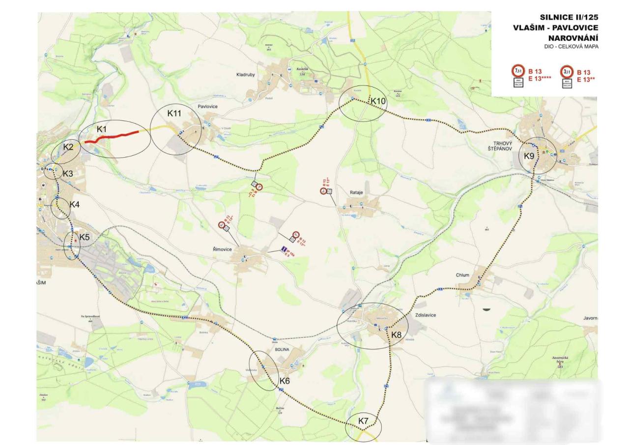 Důležitá informace pro řidiče: V přiložené mapce je znázorněna oficiální objízdná trasa pro veškerý silniční provoz při příjezdu od Vlašimi: Po silnici č. II/112 přes Bolinku, Bolinu, na silnici č. II/127 přes Zdislavice, Chlum do Trhového Štěpánova, na silnici č. II/126 směrem na Pavlovice, a zpět na silnici č. II/125.